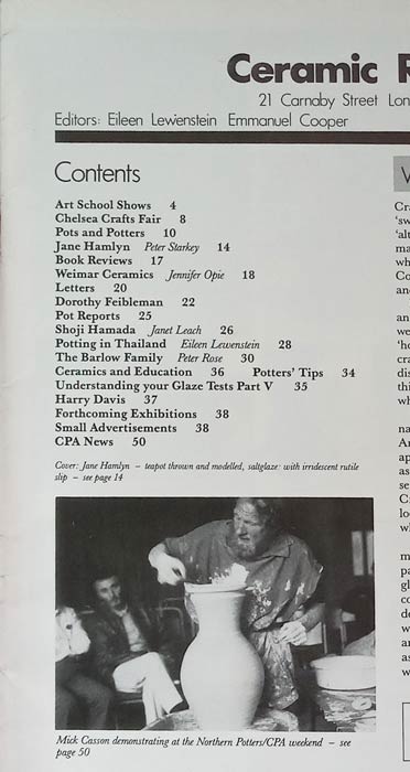 Art School Shows, Chelsea Crafts Fair, Pots & Potters & Jane Hamlyn & Weimar Cearmics, Dorothy Feibleman & Pot Reports, Shoji Hamada, Potting in Thailand, The Barlow Family, Ceramics & Education. Understanding Your Glaze Tests Pa