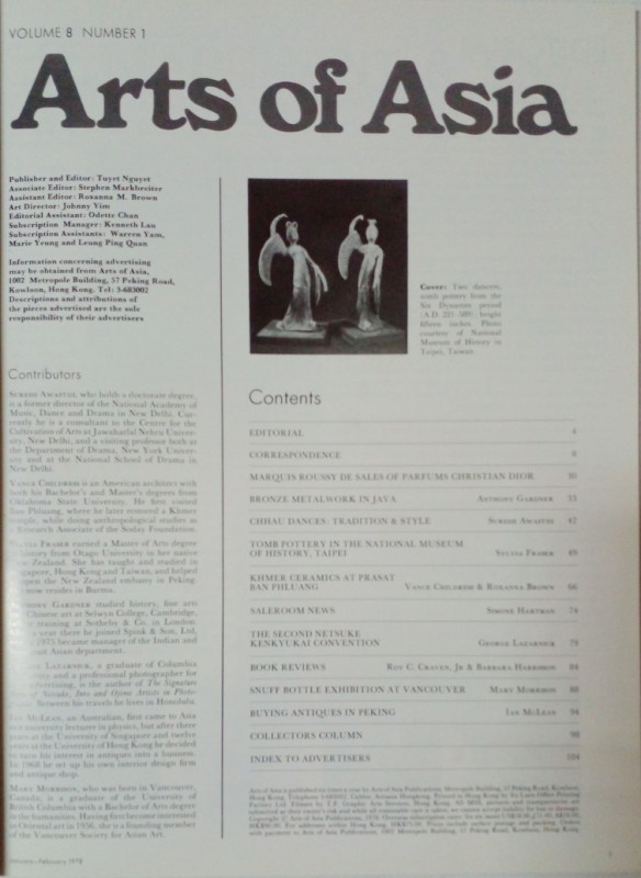 Bronze Metalwork in Java, Khmer Ceramics at Prasat Ban Phluang, The Second Netsuke Kenkyukai Convention, Snuff Bottle Exhibition at Vancouver, article in Arts of Asia (Jan-Feb, 1978)