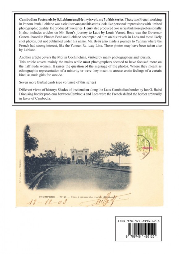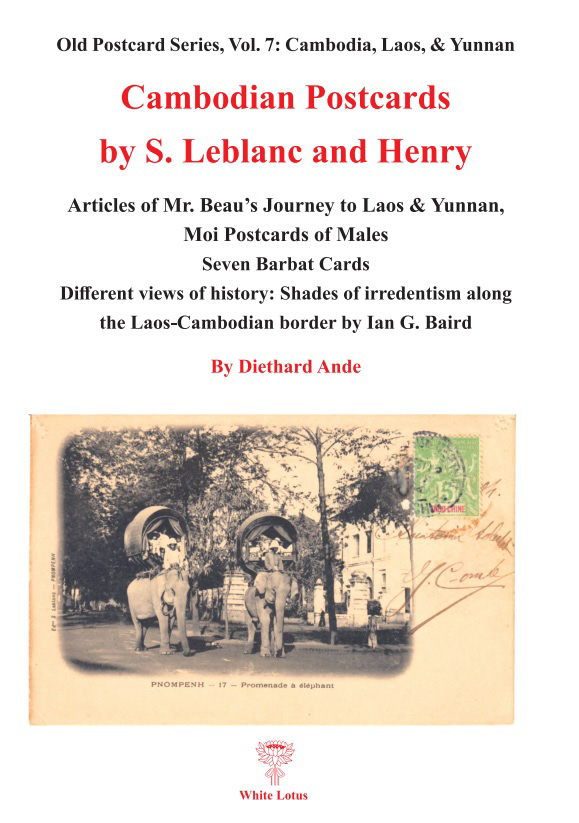Cambodian Postcards by S. Leblanc and Henry is volume 7 of this series. These two French working in Phnom Penh. Leblanc was a civil servant and his cards look like personal impressions with limited photographic quality. He produced two series. Henry also produced two series but more professionally It also includes articles on Mr. Beau's journey to Laos by Louis Vernet. Beau was the Governor General based in Phnom Penh and Leblanc accompanied him on his travels in Laos and most likely shot photos, but not published under his name. Mr. Beau also made a journey to Yunnan where the French had strong interest, like the Yunnan Railway Line. Those photos may have been taken also by Leblanc.