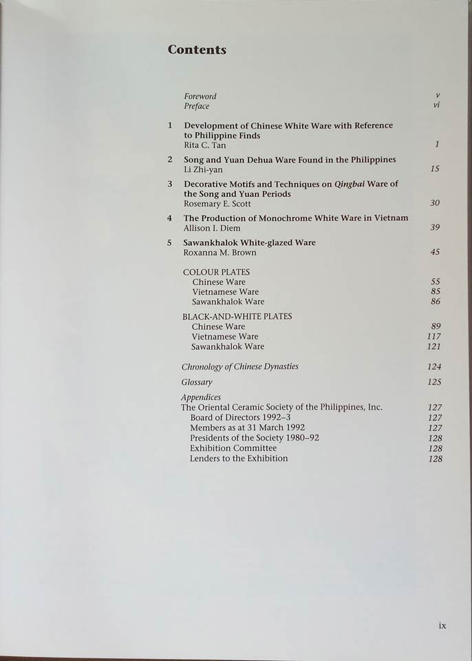 This book was published in connection with an exhibition of the Oriental Ceramic Society of the Philippines, showing ceramics from burial sites of the pre-colonial period. It highlights Chinese ceramics from Jiangxi, Fujian and Guangdong provinces as well as Thai and Vietnamese provenance. Most wares are from the Southern Song period (1127-1279). Five scholarly articles discuss the characteristics of the white wares as well as its excavations in the Philippines.
