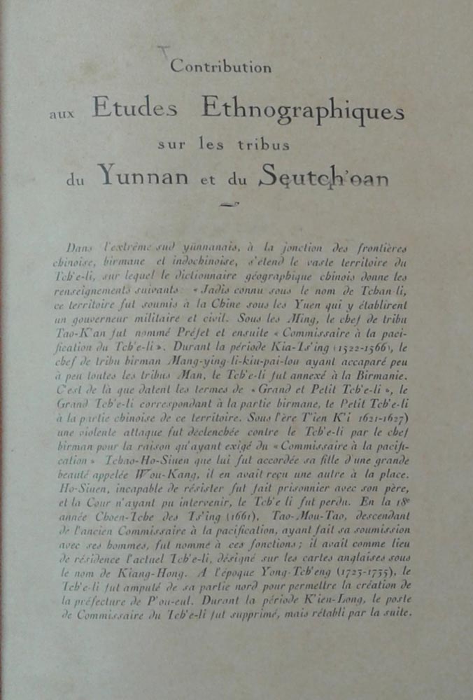 Contribution aux Etudes Ethnographiques sur les Tribus du Yunnan et du Seutch'oan
