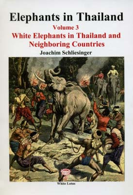 Schliesinger, Joachim; Elephants in Thailand Vol.3; White Elephants in Thailand and Neighboring Countries, defines the “white elephant”, recounts the myths about white elephants in ancient Indian lore(the Jatakas) and their transmission to Southeast Asia, presents reports of early Western travelers on the white elephants stables in Siam and Burma, and finally gives an account of the royal white elephants in contemporary Thailand. The text is complemented by 110 illustrations.