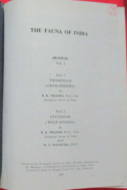 Fauna of India: Araneae Vol. 1: part 1. Thomisidae (Crab-Spiders) Part 2. Lycosidae (Wolf-Spiders), Spiders: Araneae Vol. 2 part 1. Family Gnaphosidae, Scorpions: Arachida Vol. 3