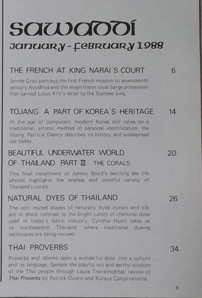French at King Narai's Court, the (9 pp), Tojang: A Part of Korea's Heritage, (6 pp), Beautiful Underwater World of Thailand Part III: the Corals, (6 pp), Natural Dyes of Thailand, (9 pp.) Thai Proverbs (2 pp.)