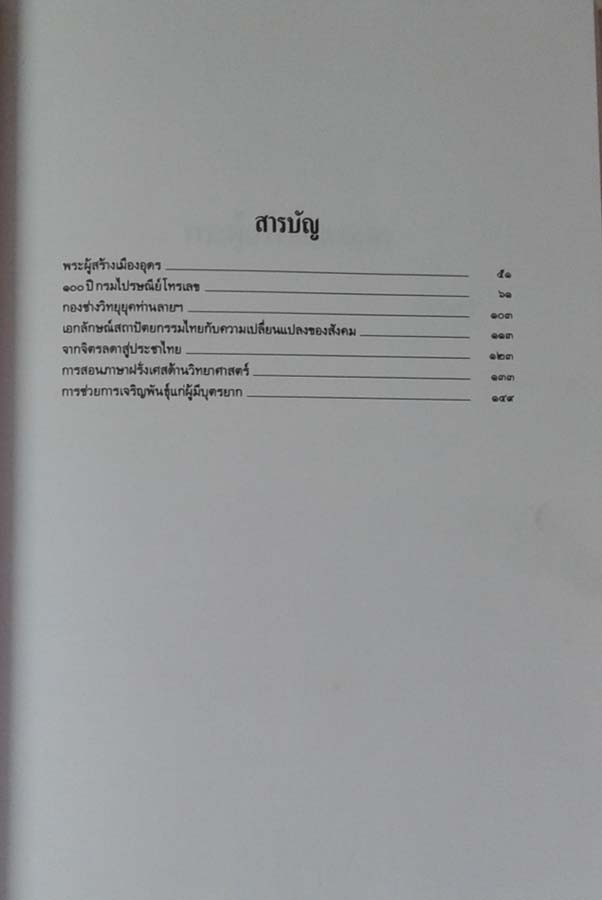 6 Articles: 1. History of Udon Thani, 2. Thai Radio 3. Thai Architecture with Thai Society, 4. From Jitlada to Pracha Thai, 5. The Science in French Language 6. The Way out to easy pregnant (A Funeral book of Prince Laichaluthong Thongyai)
