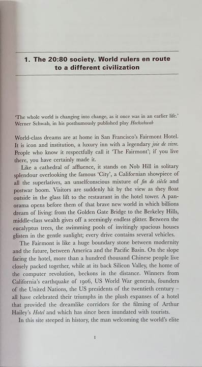 This remarkable book explores the spread of globalization and the likely consequences for jobs and democracy. The book opens a private seminar attended by 500 chief executives of major corporations, leading politicians and intellectuals in San Francisco. The conclusions were devastating. The biggest manufacturers, while shifting production away from the industrial countries, foresee a technological future in which only a fifth of the world current workforce will be needed. Millions will be unemployed and a growing gulf between the low paid and the well off will be the consequences. But, Martin and Schumann argue, we do not have to be mere cogs in a brutal global dynamic. Democratic power and economic prosperity do not have to give way to unstoppable technological and economic progress. The primacy of politics over the economy and the care of the state must, and can, be reasserted. A left wing view, trying to protect union power and privileged classes in some developed countries, and to prevent the shift to low labor cost countries, is the main line of the book.