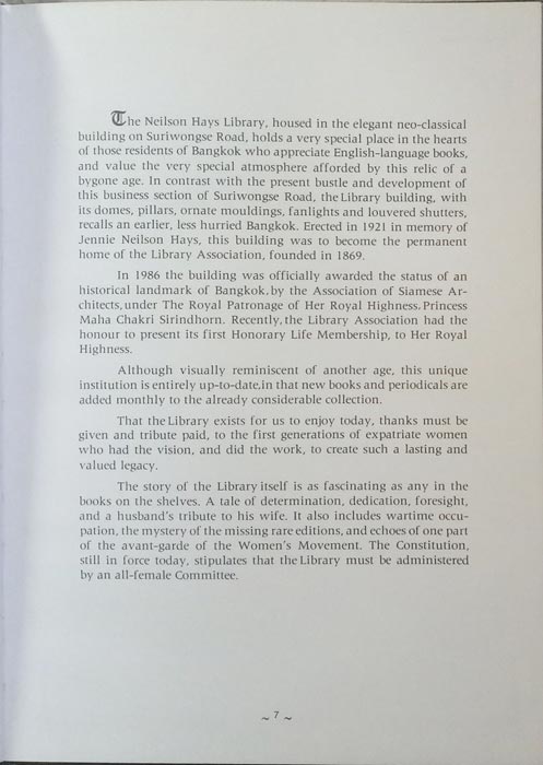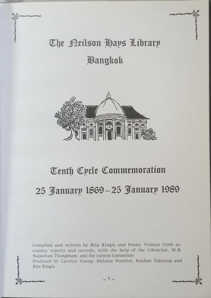 A Brief history of the Neilson Hays Library, the oldest cultural institution by foreigners living in Bangkok, to commemorate the Tenth Cycle of the founding of the Library Association on 25th January, 1989