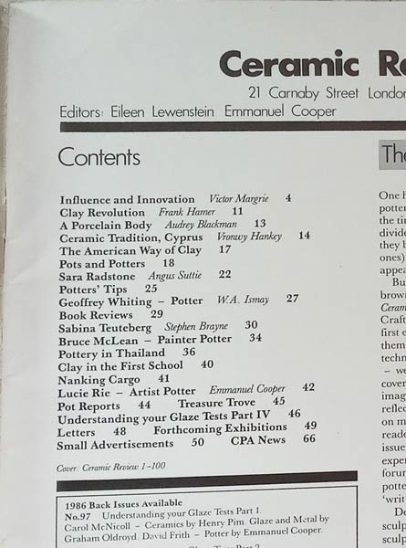 Pottery in Thailand, Clay in the First School, Nanking Cargo, Lucie Rie-Artist Potter, Pot Report, Treasure Trove, Understanding Your Glaze Tests Part IV 16 Article of Ceramic Review. No. 100. Jul-Aug. 1986