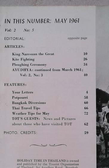 4 Articles of Holiday Time in Thailand Vol. 2 No. 5 (May 1961)