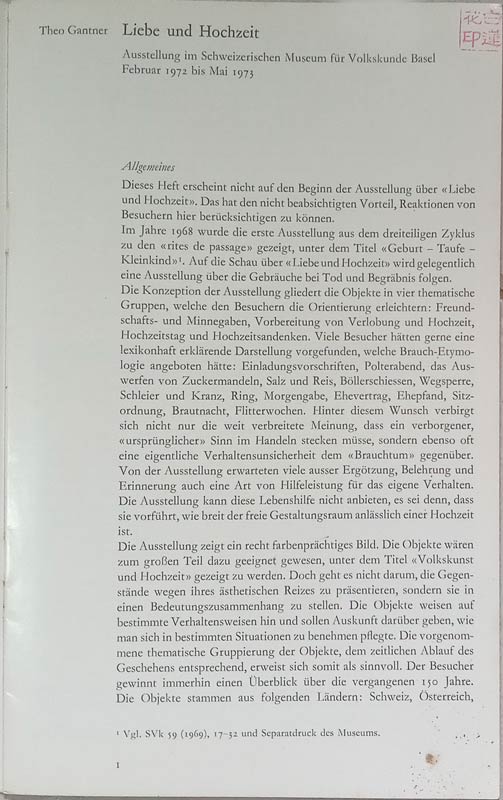 Ausstellung im Schweizerischen Museum fuer Volkskunde Basel Februar 1972 bis Mai 1973