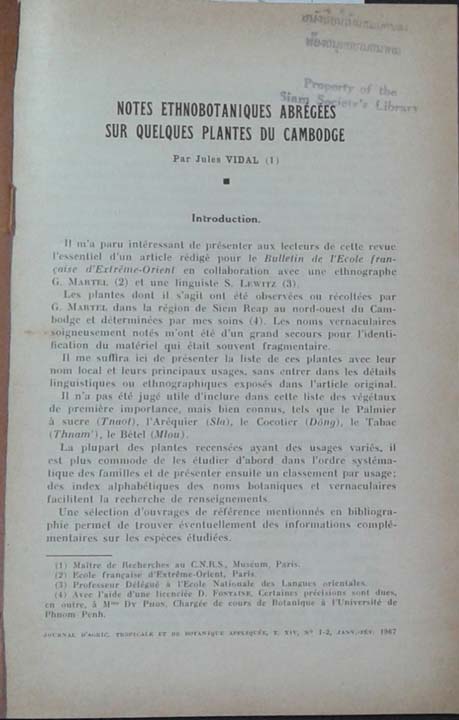 Notes Ethnobotaniques Abregees sur Quelques Plantes du Cambodge