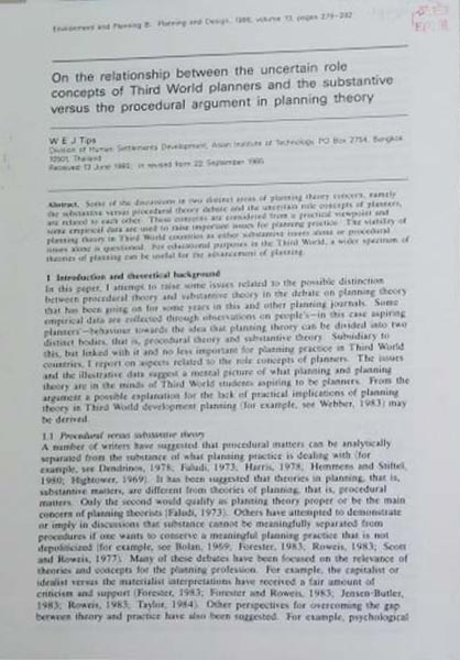 Concepts of Third World Planners and the Substantive Versus the Procedural Argument in Planning Theory