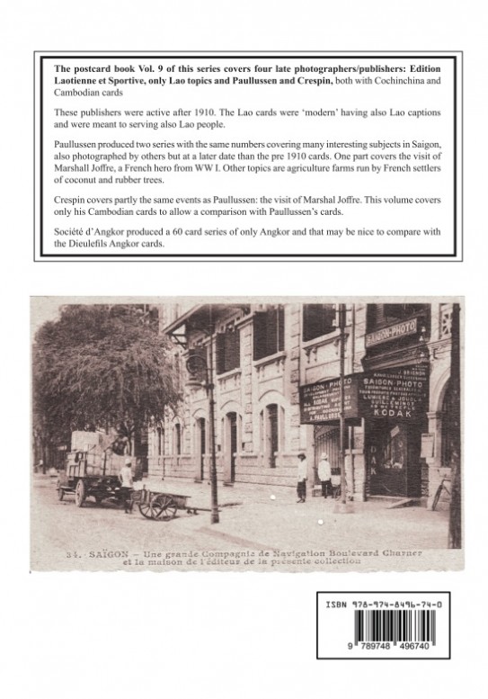 The postcard book Vol. 9 of this series covers four late photographers/publishers: Edition Laotienne et Sportive, only Lao topics and Paullussen and Crespin, both with Cochinchina and Cambodian cards