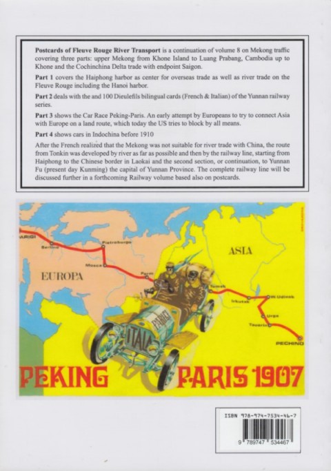Postcards of Fleuve Rouge River Transport is a continuation of volume 8 on Mekong traffic covering three parts: upper Mekong from Khone Island to Luang Prabang, Cambodia up to Khone and the Cochinchina Delta trade with endpoint Saigon.