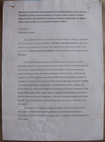 Remarks on "Laos" Role in the Development of the Greater Mekong: International Conference Business Opportunities, The Mekong Region Comes of Age 12-13 June 2003