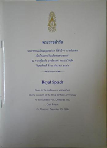 Royal Speech: Given to the audience of well-wishers On the occasion of the Royal Birthday Anniversary At the Dusidalai Hall, Chitralada Villa, Disit Palace, On Thursday, Dec. 23, 1999.
