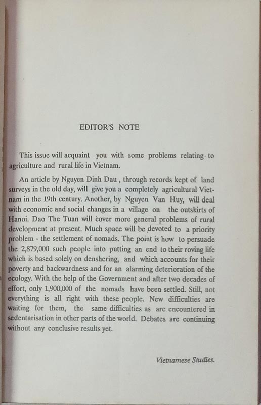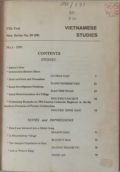Sedentation-Balance Sheet, Slash-and-Burn and Nomadism, Rural Development Problems, Social Restructuration of A Village, Preliminary Remarks on 19th Century Cadastral Registers in the Six Southern Provinces of Former Cochinchina