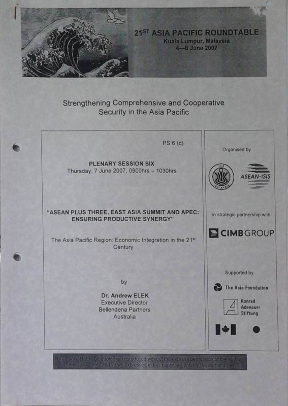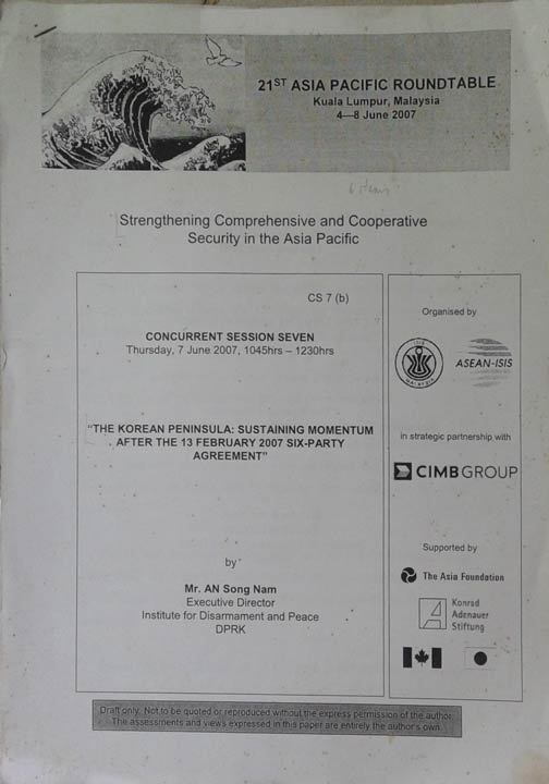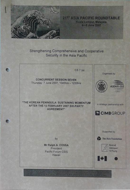 Strengthening Comprehensive and Cooperative Security in the Asia Pacific: The Korean Peninisula: Sustaining Momentum After the 13 Feb 07 Six-party Agreement, Asean Plus Three, East Asia Summit and APCE: Ensuring Productive Synergy,