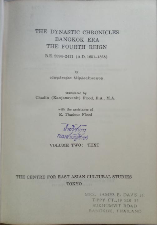 The Dynastic Chronicles Bangkok Era the Fourth Reign B.E 2394-2411 (A.D. 1851-1868) Vol. 2: Text