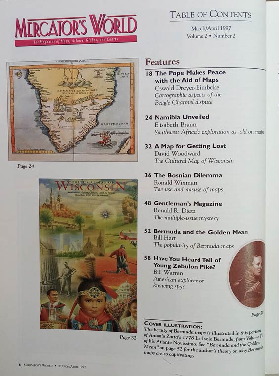 The Pope Makes Peace with the Aid of Maps, Namibia Unveiled, a Map Map for Getting Lost, the Bosnian Dilemma, Gentleman's Magazine, Bermuda and the Golded Mean, Have You Heard Tell of Young Zebulon Pike?, Charles Wilkes's Antarctic Cruise,