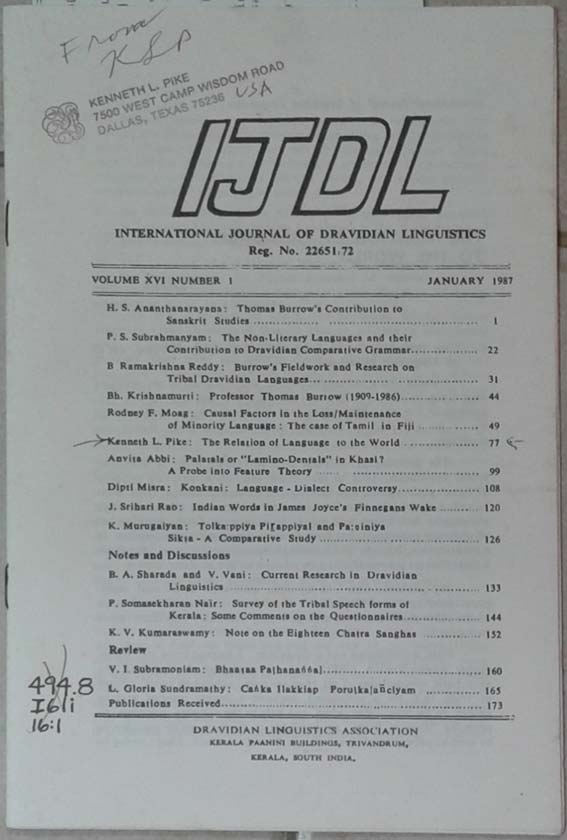 Articles of International Journal of Dravidian Linguistics Vol. XVI/1 January 1987