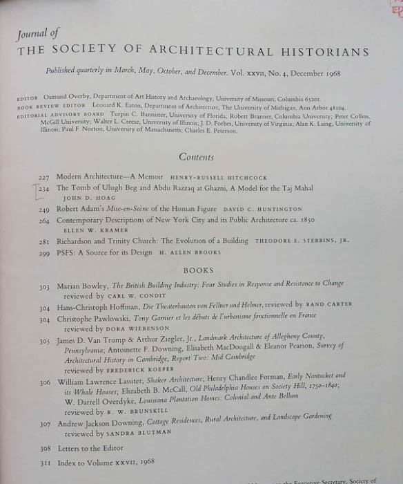 Artical in Journal of the Society of Architectural Historians December 1968 Vol. XXVII No. 4