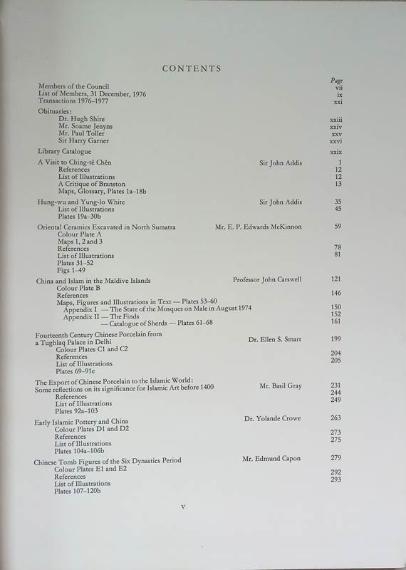 From A Tughlaq Palace in Delhi, The Export of Chinese Porcelain to the Islamic World, Early Islamic Pottery and China, Chinese Tomb Figures of the Six Dynasties Period 8 Articles of Transactions of ,.1975-1976, 1976-1977