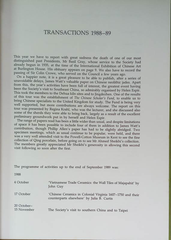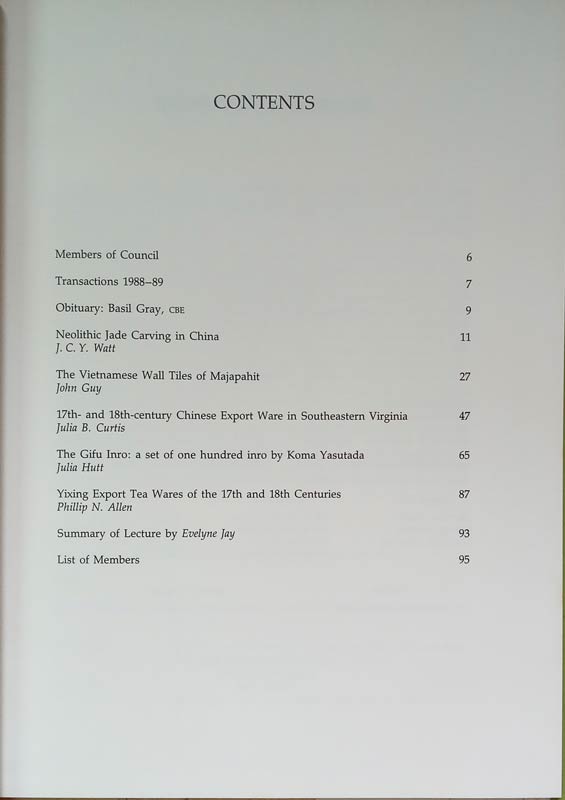 Transactions of The Oriental Ceramic Society 1988-1989: Neolithic Jade Carving in China, The Vietnamese all Tiles of Majapahit, 17th and 18th Century Chinese Export Ware in Southeastern Virginia, The Gifu Inro : A set of Hundred Inro