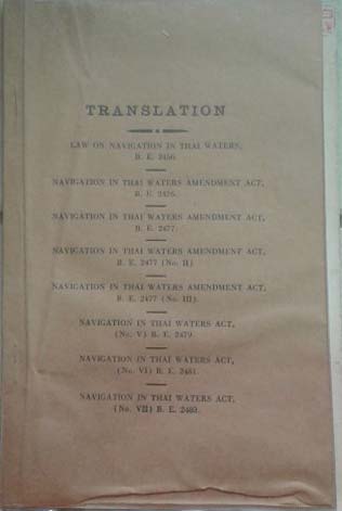 Translations: Law on Navigation in Thai Water, B.E. 2456, B.E. 2476-77 (No. I-II-II) Navigation in Thai Waters Act. (No. V) B.E. 2479, (No. VI) B.E.2481 (No. VII)B.E. 2483